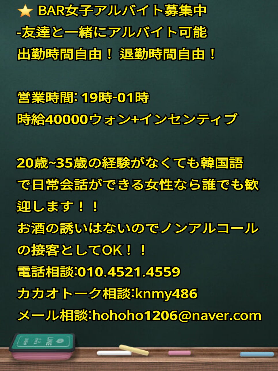 20-35歳の職場経験がなくても韓国語で日常会話ができる女性なら誰でも大歓迎!! 酒の誘い